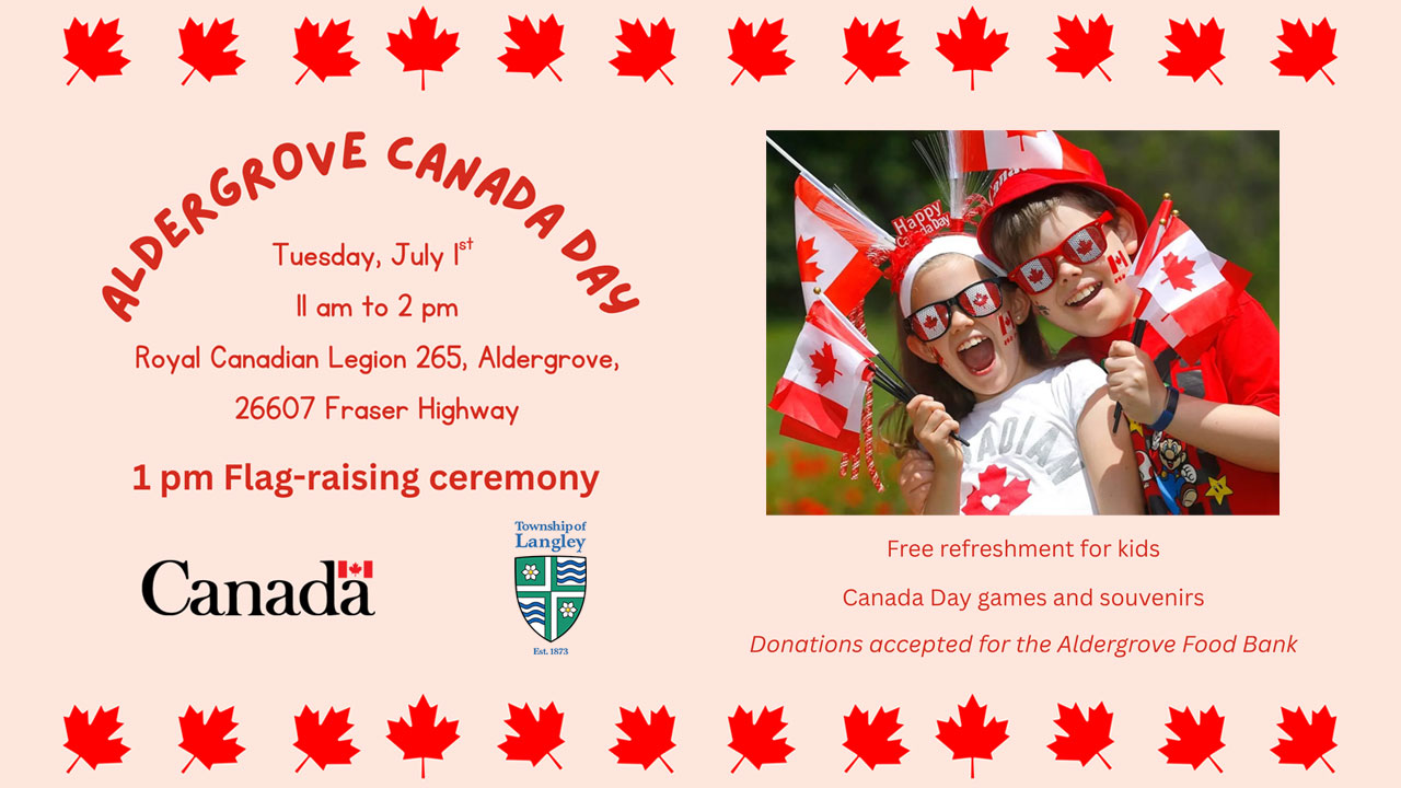 Join us Tuesday July 1, 2025 from 11:00 AM to 2:00 PM at the Royal Canadian Legion #265 (26607 Fraser Highway) for a free family-friendly event bursting with community pride and festive fun!
